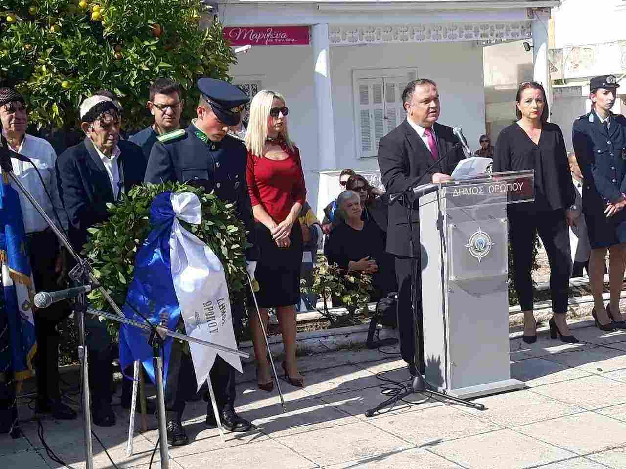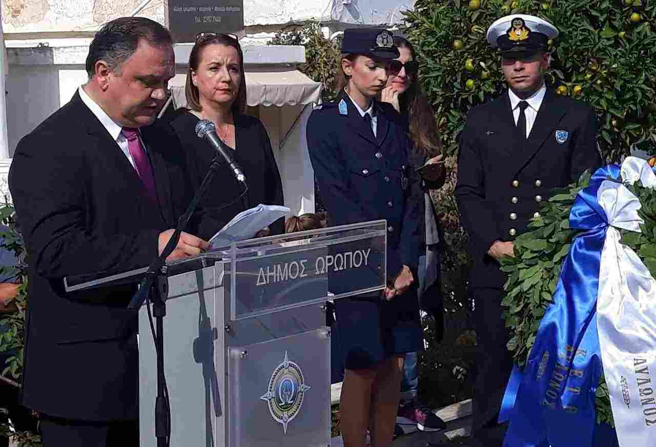 Ο Δήμαρχος Ωρωπού απηύθυνε χαιρετισμό, όπου αναφέρθηκε στην ηρωισμό των Ελλήνων στο ελληνοαλβανικό μέτωπο και εξέφρασε τη βεβαιότητα ότι και οι σημερινοί Έλληνες είναι σε θέση να οδηγήσουν την πατρίδα σε ένα καλύτερο αύριο αλλά και να αγωνιστούν αν χρειαστεί να διαφυλάξουν την εδαφική ακεραιότητα της χώρας.