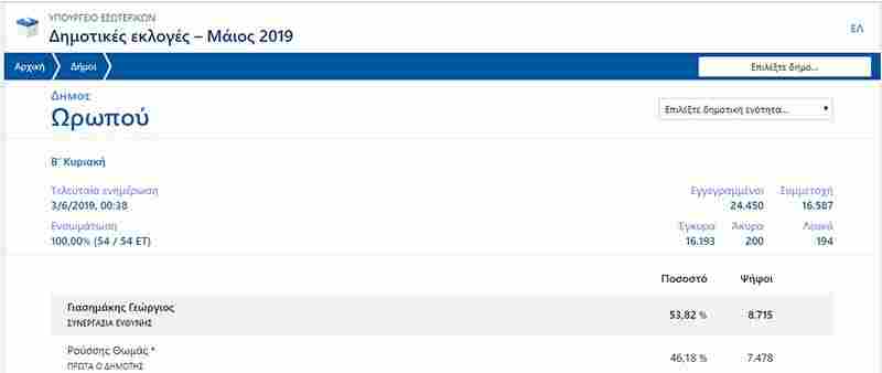 Οι επαναληπτικές δημοτικές εκλογές στο Δήμο Ωρωπού, ανέδειξαν νέο Δήμαρχο τον κ. Γιώργο Γιασημάκη, με τον Συνδυασμό «Συνεργασία Ευθύνης».
