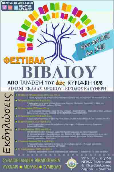 Άνοιξε τις πύλες του, χθες 18 Ιουλίου, το Φεστιβάλ Βιβλίου Ωρωπού, υπό την αιγίδα του Ν.Π.Δ.Δ. Πολιτισμού & Περιβάλλοντος. Το καλό βιβλίο ξανά στη γνώριμη θέση του, στο Λιμάνι Σκάλας Ωρωπού, για τους κατοίκους αλλά και τους θερινούς επισκέπτες της περιοχής.