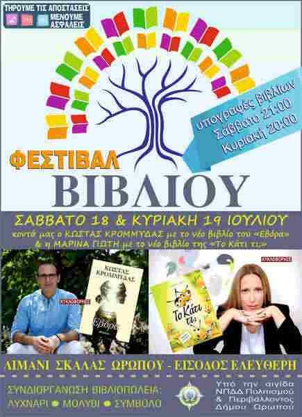 Στο ξεκίνημα του Φεστιβάλ, το Σάββατο 18 Ιουλίου, έκαναν την εμφάνισή τους ο Κώστας Κρομμύδας με το νέο βιβλίο του «Εβόρα» και η Μαρίνα Γιώτη με το νέο της βιβλίο «Το κάτι τι;», οι οποίοι θα βρίσκονται και απόψε Κυριακή 19 Ιουλίου εκεί, πρόθυμοι και με πολλά χαμόγελα να μιλήσουν με τον κόσμο και να υπογράψουν τα βιβλία τους.