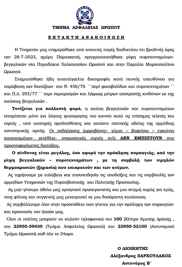 Ροή ΝέωνΤελευταία ΝέαΩρωπός Έκτακτη ανακοίνωση του Τ.Α. Ωρωπού για καύση βεγγαλικών Σοφία Μπασκάκη 29 Ιουλίου, 2023