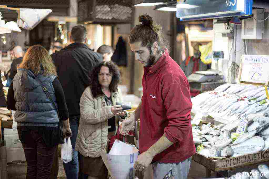 Ανάμεσα στους πάγκους με τα νωπά ψάρια και τα θαλασσινά, ένας πωλητής ξεχωρίζει.