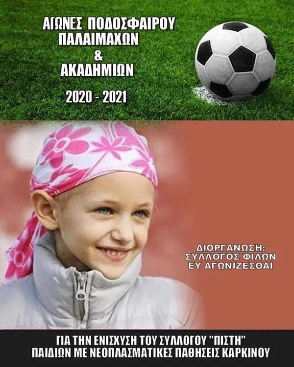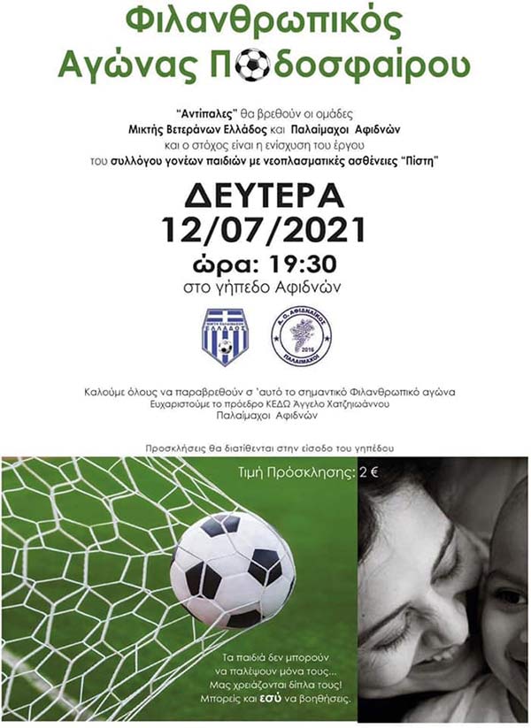 ΑΓΩΝΑΣ ΖΩΗΣ ΠΟΔΟΣΦΑΙΡΟΥ ΣΗΜΕΡΑ (12/7, 19:30) ΣΤΟ ΓΗΠΕΔΟ ΑΦΙΔΝΩΝ ΜΕΤΑΞΥ ΤΩΝ ΠΑΛΑΙΜΑΧΩΝ ΤΟΥ Α.Ο.ΑΦΙΔΝΑΪΚΟΥ ΚΑΙ ΤΩΝ ΒΕΤΕΡΑΝΩΝ ΕΛΛΑΔΑΣ ΓΙΑ ΤΗΝ ΕΝΙΣΧΥΣΗ ΤΟΥ ΣΥΛΛΟΓΟΥ “ΠΙΣΤΗ ΠΑΙΔΙΩΝ ΜΕ ΝΕΟΠΛΑΣΜΑΤΙΚΕΣ ΠΑΘΗΣΕΙΣ ΚΑΡΚΙΝΟΥ”
