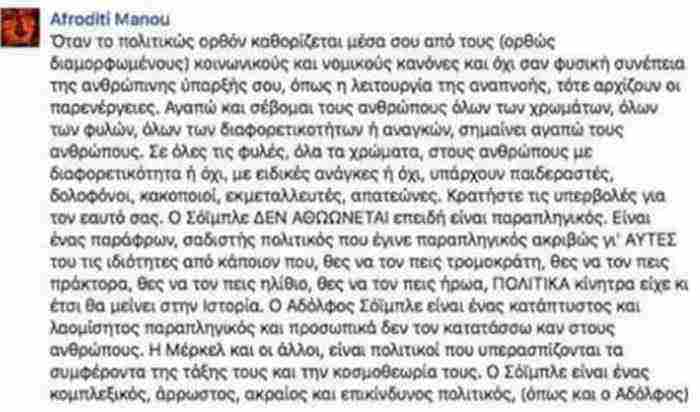 Η Αφροδίτη Μάνου έγραφε ότι ο Βόλφγκανγκ Σόιμπλε είναι παραπληγικός και αυτό δεν τον αθωώνει διότι είναι «παράφρων, σαδιστής πολιτικός που έγινε παραπληγικός γι’ αυτές του τις ιδιότητες από κάποιον που θες να τον πεις τρομοκράτη, θες να τον πεις πράκτορα, θες να τον πεις ηλίθιο, θες να τον πεις ήρωα, ΠΟΛΙΤΙΚΑ κίνητρα είχε».