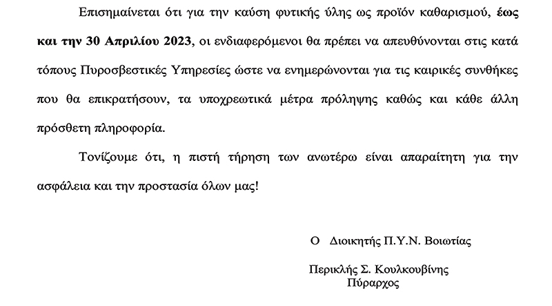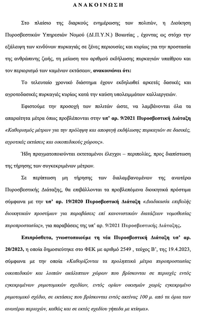 Ανακοίνωση Πυροσβεστικής Υπηρεσίας Νομού Βοιωτίας για την εξάλειψη των κινδύνων πυρκαγιάς