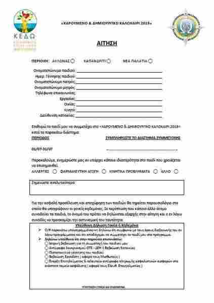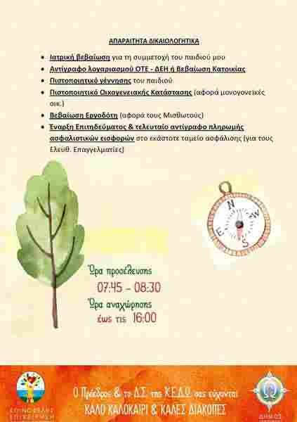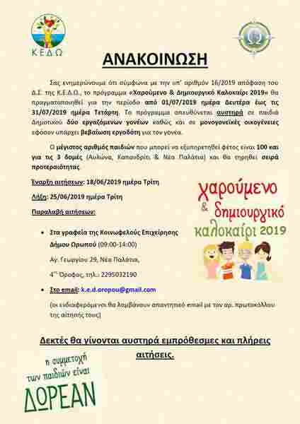 Σας ενημερώνουμε ότι σύμφωνα με την υπ’ αριθμόν 16/2019 απόφαση του Δ.Σ. της Κ.Ε.Δ.Ω., το πρόγραμμα «Χαρούμενο & Δημιουργικό Καλοκαίρι 2019» θα πραγματοποιηθεί για την περίοδο από 01/07/2019, ημέρα Δευτέρα, έως τις 31/07/2019 ημέρα Τετάρτη. Το πρόγραμμα απευθύνεται αυστηρά σε παιδιά Δημοτικού δύο εργαζόμενων γονέων, καθώς και σε μονογονεϊκές οικογένειες, εφόσον υπάρχει βεβαίωση εργοδότη για τον γονέα.