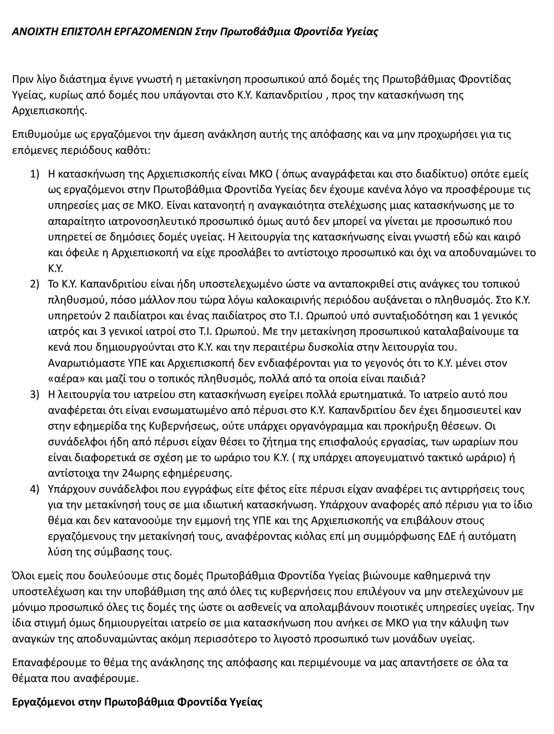 Ανοιχτή επιστολή εργαζομένων στην Πρωτοβάθμια Φροντίδα Υγείας