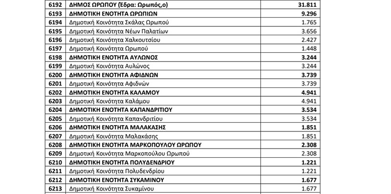 Σημαντικές αλλαγές παρουσιάζει η κατανομή των εδρών στον Δήμο Ωρωπού, στις επερχόμενες δημοτικές εκλογές, μετά και την επίσημη ανακοίνωση του πληθυσμού κατά Δημοτική Ενότητα.
