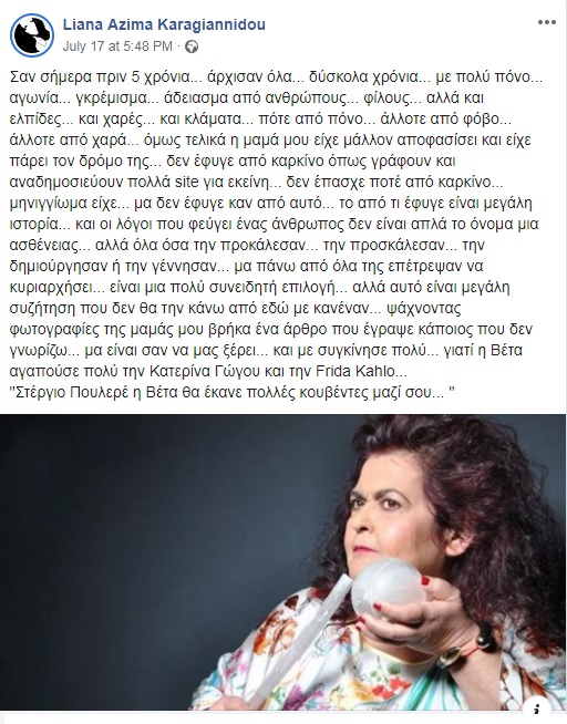 «Σαν σήμερα πριν 5 χρόνια… άρχισαν όλα… δύσκολα χρόνια… με πολύ πόνο… αγωνία… γκρέμισμα… άδειασμα από ανθρώπους… φίλους… αλλά και ελπίδες… και χαρές… και κλάματα… πότε από πόνο… άλλοτε από φόβο… άλλοτε από χαρά… όμως τελικά η μαμά μου είχε μάλλον αποφασίσει και είχε πάρει τον δρόμο της… Δεν έφυγε από καρκίνο όπως γράφουν και αναδημοσιεύουν πολλά site για εκείνη… δεν έπασχε ποτέ από καρκίνο… μηνιγγίωμα είχε…
