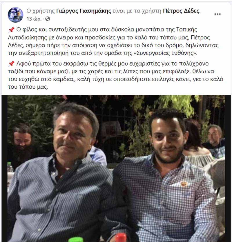 Η αντίδραση του Δημάρχου Γ. Γιασημάκη στην ανεξαρτητοποίηση του Π. Δέδε υπήρξε απρόσμενη, όσο και συγκινητική. Πέρα από την όποια δικαιολογημένη πικρία, ο Δήμαρχος απέδειξε ότι έχει ένα διαφορετικό πολιτικό πολιτισμό, καθώς μίλησε με σεβασμό απέναντι στην απόφαση του πρώην συνεργάτη του, δεν έδειξε εχθρική διάθεση, γιατί θεωρεί πολιτικό του παιδί τον Π. Δέδε, που συμπορεύτηκαν μαζί σε δύσκολα χρόνια. Αυτό αποδυκνείτεαι τόσο από όσα είπε ο κ. Γιασημάκης μέσα στο Συμβούλιο, όσο και από την ανάρτηση που έκανε λίγες μέρες πριν, στον προσωπικό λογαριασμό του στο Facebook.