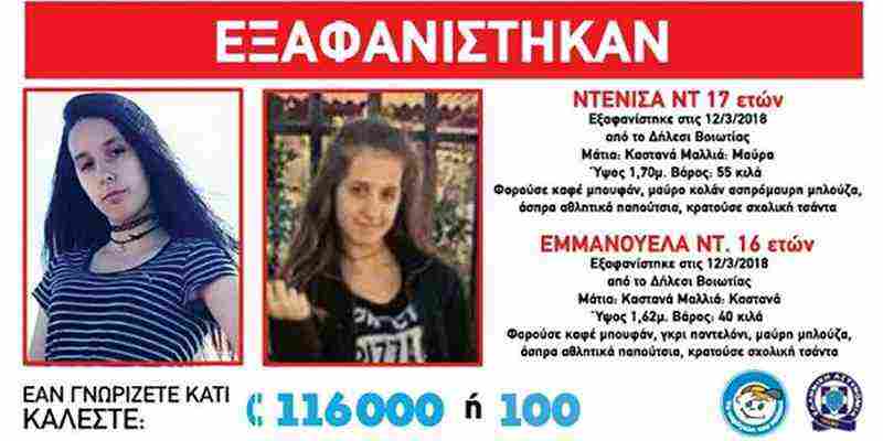 Βρέθηκαν οι δύο αδελφές από το Δήλεσι που αγνοούνταν από τη Δευτέρα 12 Μαρτίου. Επικοινώνησαν χθες το απόγευμα μέσω της γραμμής «Το Χαμόγελο του Παιδιού» με το Αστυνομικό Τμήμα Τανάγρας και έπειτα με τον ίδιο τον Αστυνομικό Διευθυντή Βοιωτίας