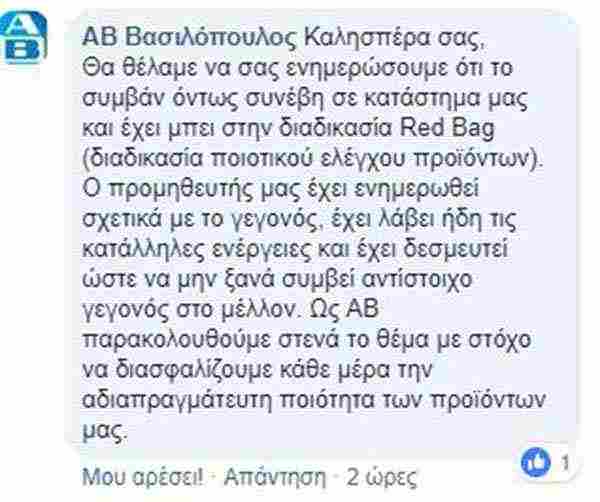 Η γνωστή αλυσίδα σουπερμάρκετ ΑΒ ΒΑΣΙΛΟΠΟΥΛΟΣ παραδέχτηκε το συμβάν μέσω διαδικτύου και ζήτησε συγγνώμη από τους καταναλωτές, ενώ ενημέρωσε ότι έχουν κινηθεί όλες οι απαραίτητες διαδικασίες ποιοτικού ελέγχου.