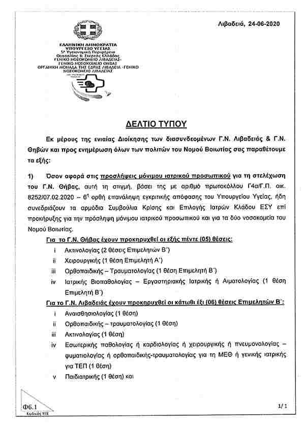 Ροή ΝέωνΣτερεάς ΕλλάδαςΤελευταία Νέα Γ.Ν. ΛΙΒΑΔΕΙΑΣ & Γ.Ν. ΘΗΒΩΝ: Προσλήψεις μόνιμου ιατρικού προσωπικού Σοφία Μπασκάκη 25 Ιουνίου, 2020
