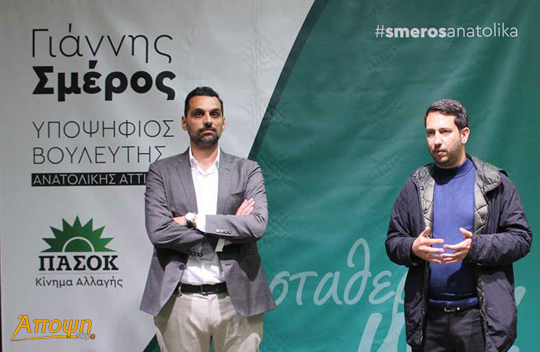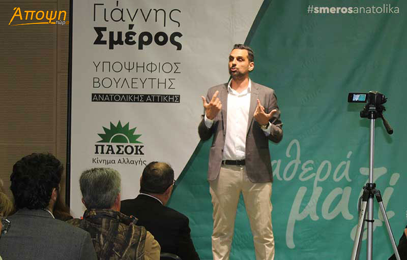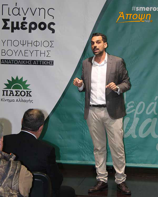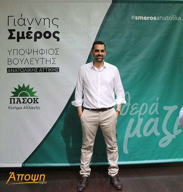 Ο Γιάννης Σμέρος ένας νέος άνθρωπος, με μακρά θητεία στην Τοπική Αυτοδιοίκηση όντας Περιφερειακός Σύμβουλος στην Περιφέρεια Αττικής και τώρα ως υποψήφιος Βουλευτής. Πάντα με εντιμότητα, ήθος δίπλα στους πολίτες έδινε και δίνει τη μάχη της καθημερινότητας. Ζήτησε την στήριξη των πολιτών με την θετική ψήφο τους στο ΠΑΣΟΚ και τον ίδιο ώστε να συνεχίσει να προσφέρει στους πολίτες της Ανατολικής Αττικής και της χώρας.