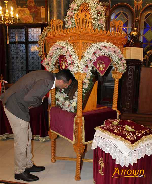 Μετά την ομιλία του ο Υποψήφιος Βουλευτής του ΠΑΣΟΚ Γ. Σμέρος μετέβη στον εορτάζοντα Ιερό Ναό του Αγίου Γεωργίου, Νέων Παλατίων για να προσκυνήσει, όπου είχε συνάντηση με τον Σεβασμιότατο Μητροπολίτη Κηφισίας Αμαρουσίου Μαραθώνα και Ωρωπού κ.κ. Κύριλλο και τον Δήμαρχο Ωρωπού Γιώργο Γιασημάκη.