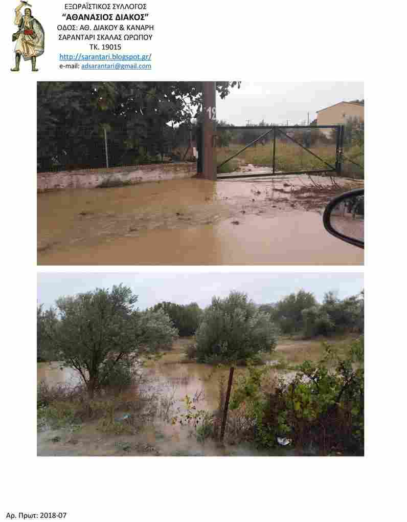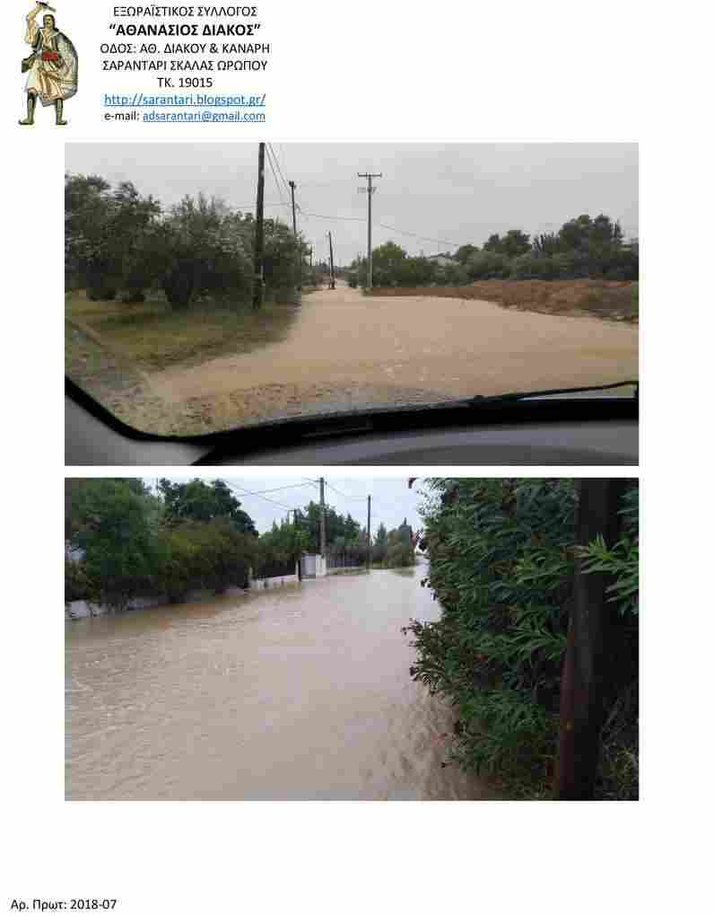 Ο Εξωραϊστικός Σύλλογος “Αθανάσιος Διάκος”, την Κυριακή 30 Σεπτεμβρίου, κατέθεσε στην Περιφέρεια Αττικής επιστολή με αίτημα την άμεση διάνοιξη και οριοθέτηση του ρέματος που διέρχεται βόρεια του οικισμού και το οποίο προκαλεί πλυμμυρικά φαινόμενα στον οικισμό, όπως αυτά που συνέβησαν την ίδια μέρα, 30/9/2018, με τις σφοδρές βροχοπτώσεις.