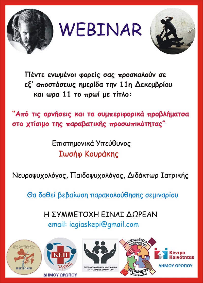Ο Δήμος Ωρωπού, το ΚΕΠ Υγείας, η Δημοτική Κοινότητα Ωρωπού σε συνεργασία με το Σύλλογο Αγία Σκέπη, το Σύλλογο Γονέων & Κηδεμόνων 1ου Γυμνασίου Χαλκουτσίου, τον Σύλλογο Γονέων και Κηδεμόνων 1ου Δημοτικού Χαλκουτσίου και τη Μαρία Κασαμπαλάκου σας προσκαλούν σε δύο επιμορφωτικές ημερίδες εξ αποστάσεως που θα γίνουν το σαββατοκύριακο 11-12 Δεκεμβρίου 2021.
