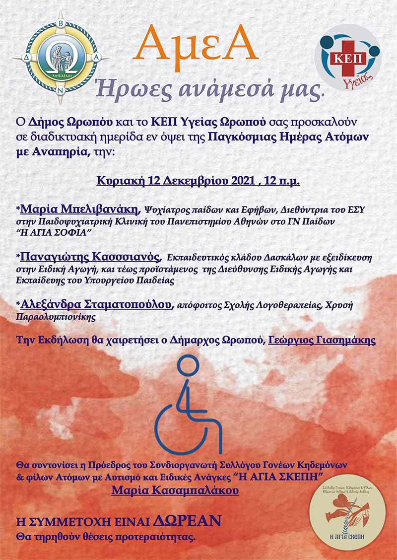Ο Δήμος Ωρωπού εν όψει της Παγκόσμιας Ημέρας Ατόμων με Αναπηρία διοργανώνει σε συνεργασία με τον Πανελλήνιο Σύλλογο Γονέων Κηδεμόνων & φίλων Ατόμων με Αυτισμό και Ειδικές Ανάγκες «Η Αγία Σκέπη», Διαδικτυακή Ημερίδα(webinar) με τίτλο: