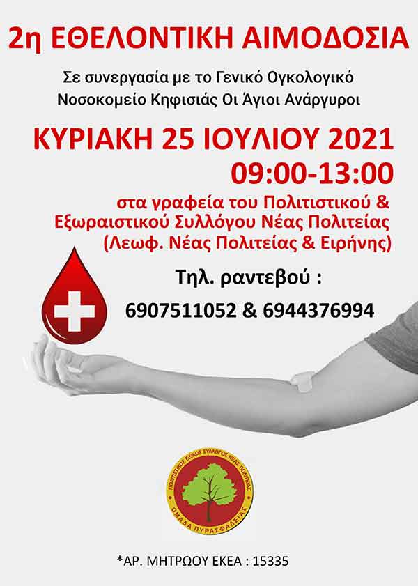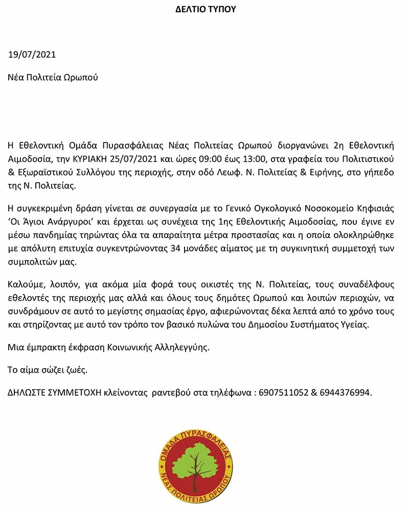 Ροή ΝέωνΤελευταία ΝέαΩρωπός Εθελοντική αιμοδοσία από την Εθελοντική Ομάδα Πυρασφάλειας Νέας Πολιτείας Ωρωπού Σοφία Μπασκάκη 22 Ιουλίου, 2021