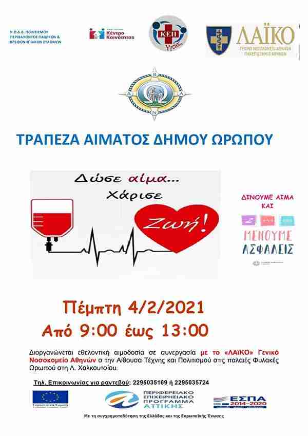 Σε μία κρίσιμη περίοδο που οι τράπεζες αίματος της χώρας έχουν τεράστιες ανάγκες, ο Δήμος Ωρωπού θα πραγματοποιήσει εθελοντική αιμοδοσία την Πέμπτη 4 Φεβρουαρίου 2021 στην Αίθουσα Τέχνης και Πολιτισμού στις παλιές Φυλακές Ωρωπού στη Λ.Χαλκουτσίου από τις 09:00 έως 13:00.