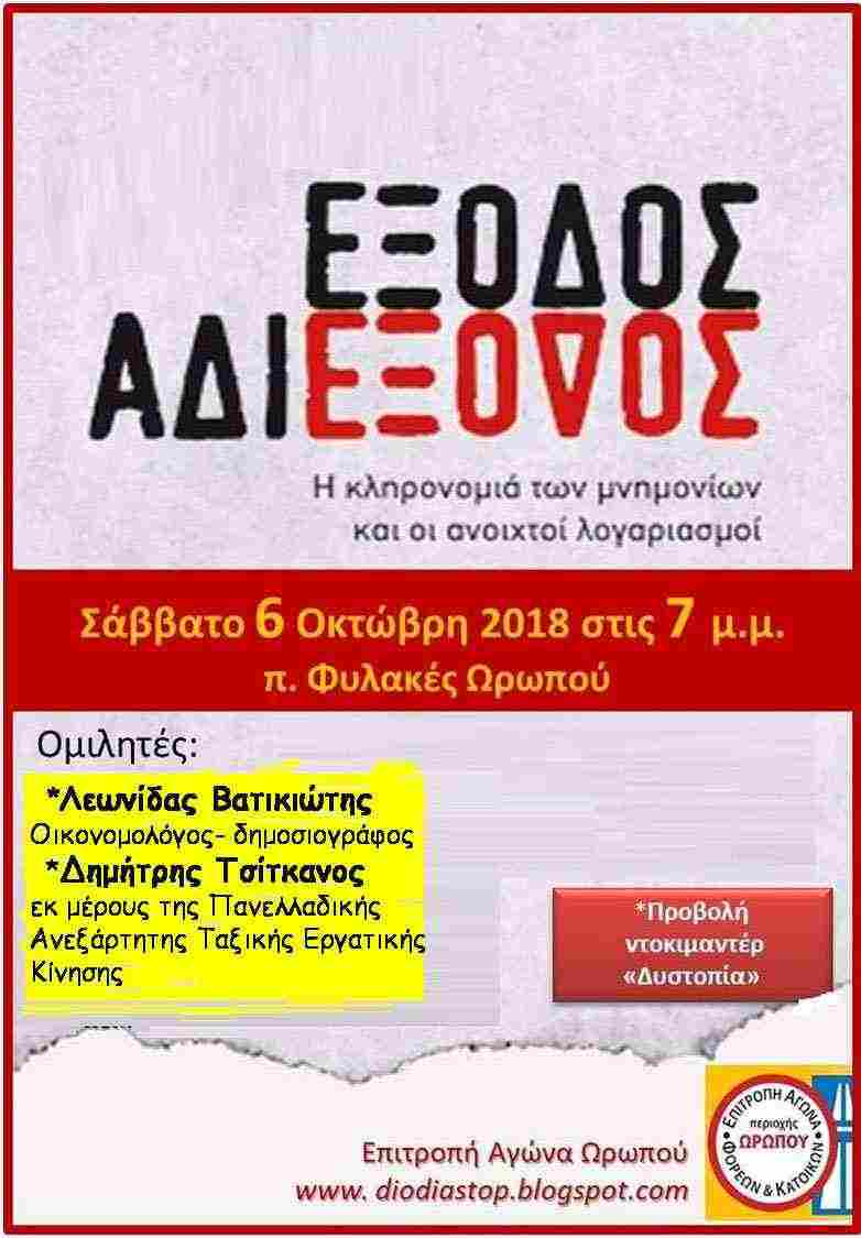 η ΕΠΙΤΡΟΠΗ ΑΓΩΝΑ ΩΡΩΠΟΥ η ΑΝΤΙΦΑΣΙΣΤΙΚΗ ΠΡΩΤΟΒΟΥΛΙΑ & η ΑΝΟΙΧΤΗ ΛΑΪΚΗ ΣΥΝΕΛΕΥΣΗ του ΔΗΜΟΥ ΔΙΟΝΥΣΟΥ δημιούργησαν μια ταινία μικρού μήκους με θέμα τη ΔΥΣΤΟΠΙΑ που ζούμε σήμερα στα χρόνια του σύγχρονου καπιταλισμού.