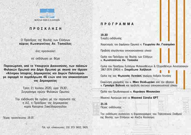 Την Τρίτη 21 Ιουλίου 2020, ώρα 19.30΄, ο Δήμος Ωρωπού υποδέχεται στον χώρο των παλαιών Φυλακών Ωρωπού, κατόπιν προσκλήσεως του Προέδρου της Βουλής κυρίου Κωνσταντίνου Τασούλα, την πολιτειακή και πολιτική ηγεσία της χώρας, σε εκδήλωση που πραγματοποιεί η Βουλή των Ελλήνων, με θέμα την παραχώρηση από το Υπουργείο Δικαιοσύνης των παλαιών Φυλακών Ωρωπού στο Δήμο μας, με σκοπό την ίδρυση «Κέντρου Ιστορίας, Δημοκρατίας και Δομών Πολιτισμού» με αφορμή τη συμπλήρωση 46 ετών από την αποκατάσταση της Δημοκρατίας.