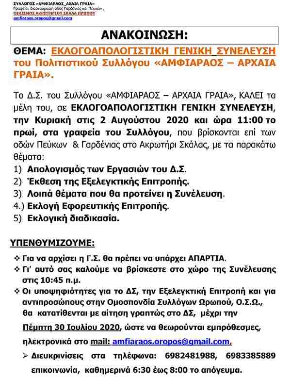 ΕΚΛΟΓΟΑΠΟΛΟΓΙΣΤΙΚΗ ΓΕΝΙΚΗ ΣΥΝΕΛΕΥΣΗ του Πολιτιστικού Συλλόγου «ΑΜΦΙΑΡΑΟΣ – ΑΡΧΑΙΑ ΓΡΑΙΑ»