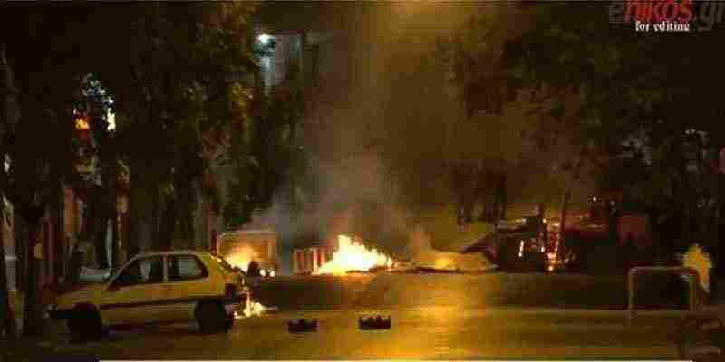 Σε πεδίο μάχης έχουν μετατρέψει κουκουλοφόροι τα Εξάρχεια που πετούν μολότοφ προς τους αστυνομικούς ακόμη και από ταράτσες. Οι φωτιές έχουν σχηματίσει πύρινα οδοφράγματα στη μέση του δρόμου, ενώ μέσα στις φλόγες ρίχνουν εύφλεκτα υλικά για να φουντώσουν τη φωτιά.