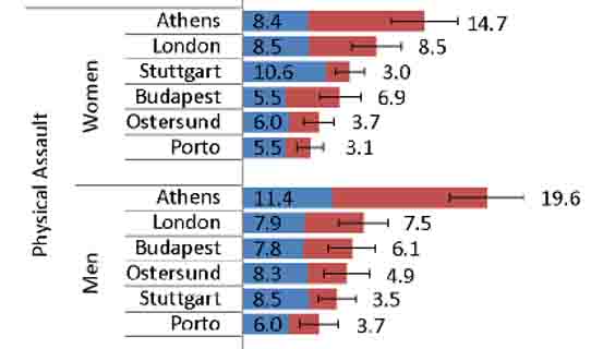 ενώ το 12,7% των ανδρών που εξετάστηκε ξεχωριστά ανέφερε ότι αναγκάστηκε να καταφύγει σε νοσοκομείο για την περιποίηση τραυμάτων που οφείλονταν σε γυναικεία επίθεση.