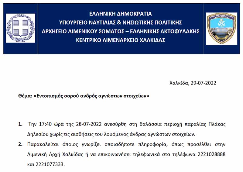 Λιμενική Αρχή Χαλκίδας, με ανακοίνωση της, παρακαλεί όποιος γνωρίζει οποιαδήποτε πληροφορία, όπως προσέλθει στην