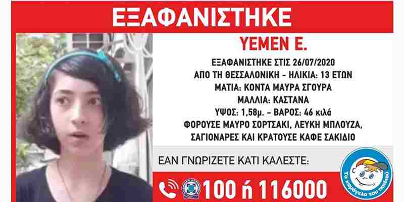Για την εξαφάνιση, το Χαμόγελο του Παιδιού αναφέρει, συγκεκριμένα, τα εξής: Στις 26/7/2020, στις 14:00, εξαφανίστηκε από το σπίτι της στην περιοχή της Θεσσαλονίκης, η Υεμέν Ε., 13 ετών. Το Χαμόγελο του Παιδιού ενημερώθηκε για την εξαφάνιση της Υεμέν Ε. σήμερα, 29/07/2020, και προχώρησε άμεσα στη δημοσιοποίηση των στοιχείων της. Η Υεμέν Ε. έχει ύψος 1,58 μ., 46 κιλά βάρος, μαύρα κοντά σγουρά μαλλιά και καστανά μάτια. Την ημέρα που εξαφανίστηκε φορούσε μαύρο σορτσάκι, λευκή μπλούζα, σαγιονάρες και κρατούσε καφέ σακίδιο.
