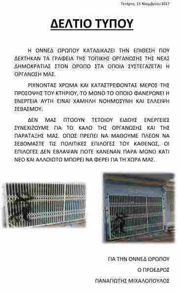 Επίθεση στα γραφεία της ΟΝΝΕΔ Ωρωπού