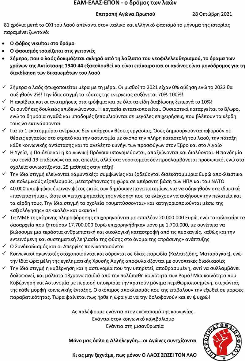 ΠολιτικήΡοή ΝέωνΤελευταία ΝέαΩρωπός ΕΠΙΤΡΟΠΗ ΑΓΩΝΑ ΩΡΩΠΟΥ: ΕΑΜ-ΕΛΑΣ-ΕΠΟΝ-ο δρόμος των λαών Σοφία Μπασκάκη 28 Οκτωβρίου, 2021