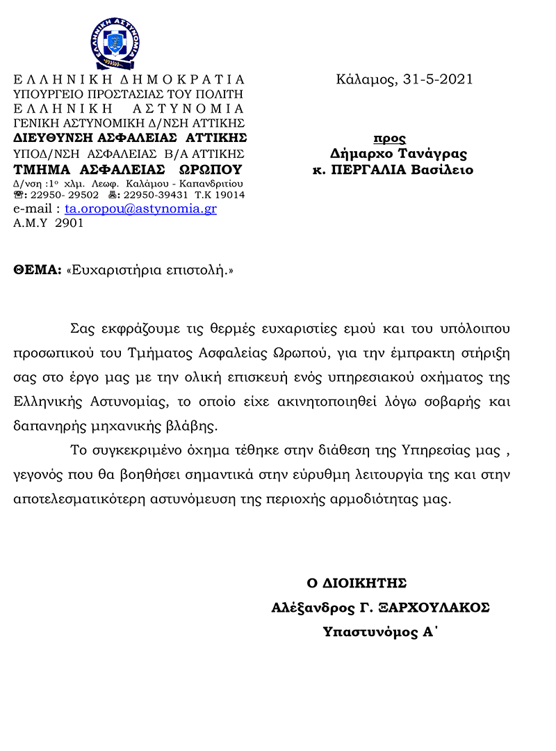 Ροή ΝέωνΤανάγραΤελευταία Νέα Ευχαριστήρια επιστολή προς το Δήμαρχο Τανάγρας από το Τ.Α. Ωρωπού Σοφία Μπασκάκη 31 Μαΐου, 2021