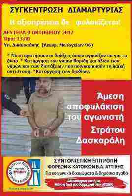 Η συνάντηση των επιτροπών αγώνα Κηφισίας, Διονύσου και Ωρωπού καθώς και συλλογικοτήτων από την περιοχή της Αθήνας και του Πειραιά, καταγγέλλει την άδικη  φυλάκιση του αγωνιστή Στράτου Δασκαρόλη.
