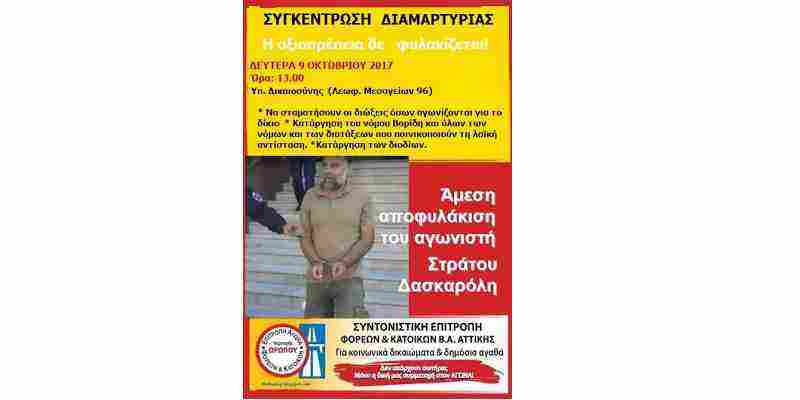 Την Άμεση αποφυλάκιση και αθώωση του Στράτου Δασκαρόλη και όλων των συναγωνιστών που διώκονται για τη συμμέτοχη τους στο κίνημα ενάντια στα διόδια.