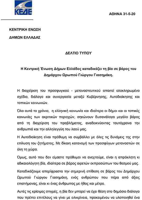 Η Κεντρική Ένωση Δήμων Ελλάδος καταδικάζει τη βία σε βάρος του Δημάρχου Ωρωπού Γιώργου Γιασημάκη