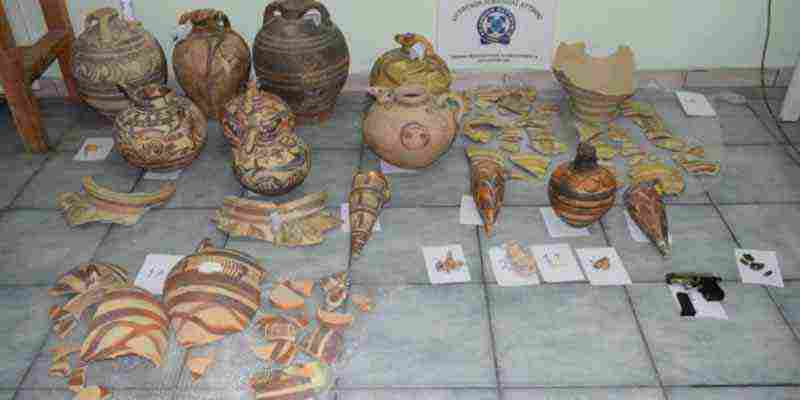 «Τα αρχαία αντικείμενα εντοπίστηκαν κρυμμένα σε θάμνους, σε έκταση περίπου 150μ., τοποθετημένα σε πλαστικές σακούλες. Ορισμένα από τα πήλινα αντικείμενα, λόγω της φωτιάς έφεραν ίχνη αιθάλης ενώ τα περισσότερα βρέθηκαν άθικτα λόγω της έγκαιρης παρέμβασης των ανδρών της Πυροσβεστικής Υπηρεσίας» συνεχίζει η ανακοίνωση του ΥΠΠΟΑ, προσθέτοντας ότι «πολλά από αυτά είχαν καθαριστεί και μερικώς συγκολληθεί επιτόπου, όπως προκύπτει από την ανεύρεση στον χώρο σχετικού εξοπλισμού».