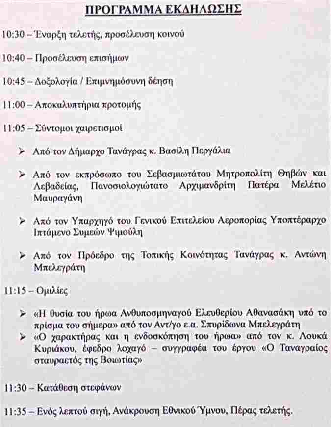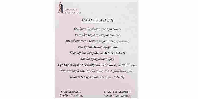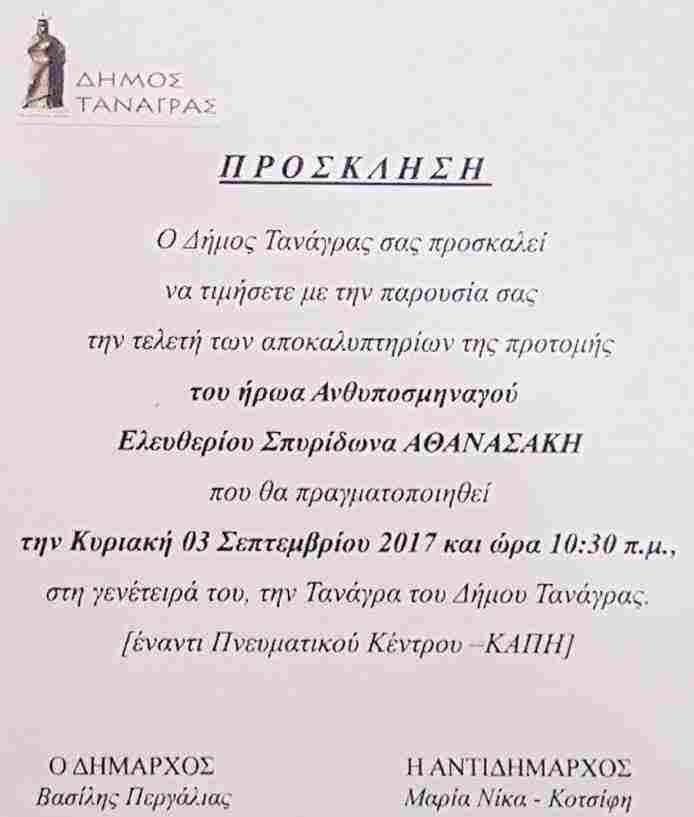 Τα αποκαλυπτήρια της προτομής του Βοιωτού ήρωα Ανθυποσμηναγού Ελευθέριου Αθανασάκη, θα πραγματοποιήσει ο Δήμος Τανάγρας, την Κυριακή, 3 Σεπτεμβρίου 2017 και ώρα 10:30 π.μ. στη γενέτειρά του την Τανάγρα.