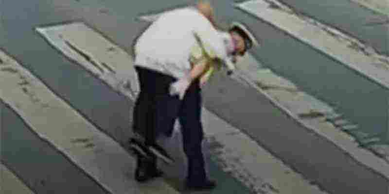 Ο ηλικιωμένος βρισκόταν μόλις στο ένα τρίτο της διάβασης πεζών όταν άναψε το πράσινο φως για την κίνηση των οχημάτων. Τότε, ο τροχονόμος πλησίασε τον ηλικιωμένο, τον πήρε στις πλάτες του για να περάσουν γρήγορα και με ασφάλεια τον δρόμο.