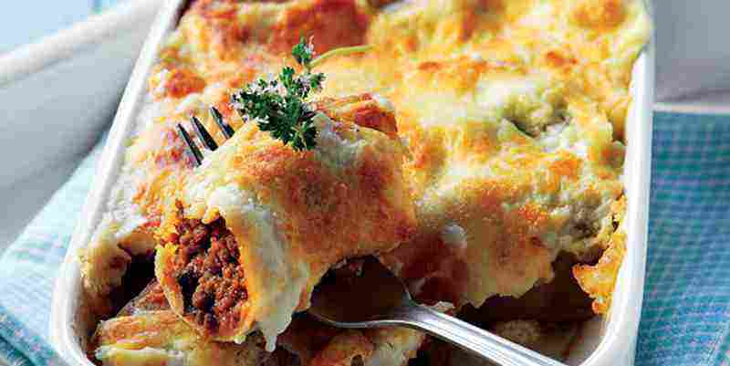 Γεμίζουμε τα κανελόνια με μικρό κουτάλι ή με το χέρι. Τα αραδιάζουμε σε λαδωμένο ταψάκι κοντά κοντά. Περιχύνουμε με τη σάλτσα ντομάτας και στη συνέχεια με την κρέμα. Πασπαλίζουμε με το τυρί και ψήνουμε για 35΄ στους 180οC στις αντιστάσεις, μέχρι να ροδίσει λίγο η επιφάνεια.