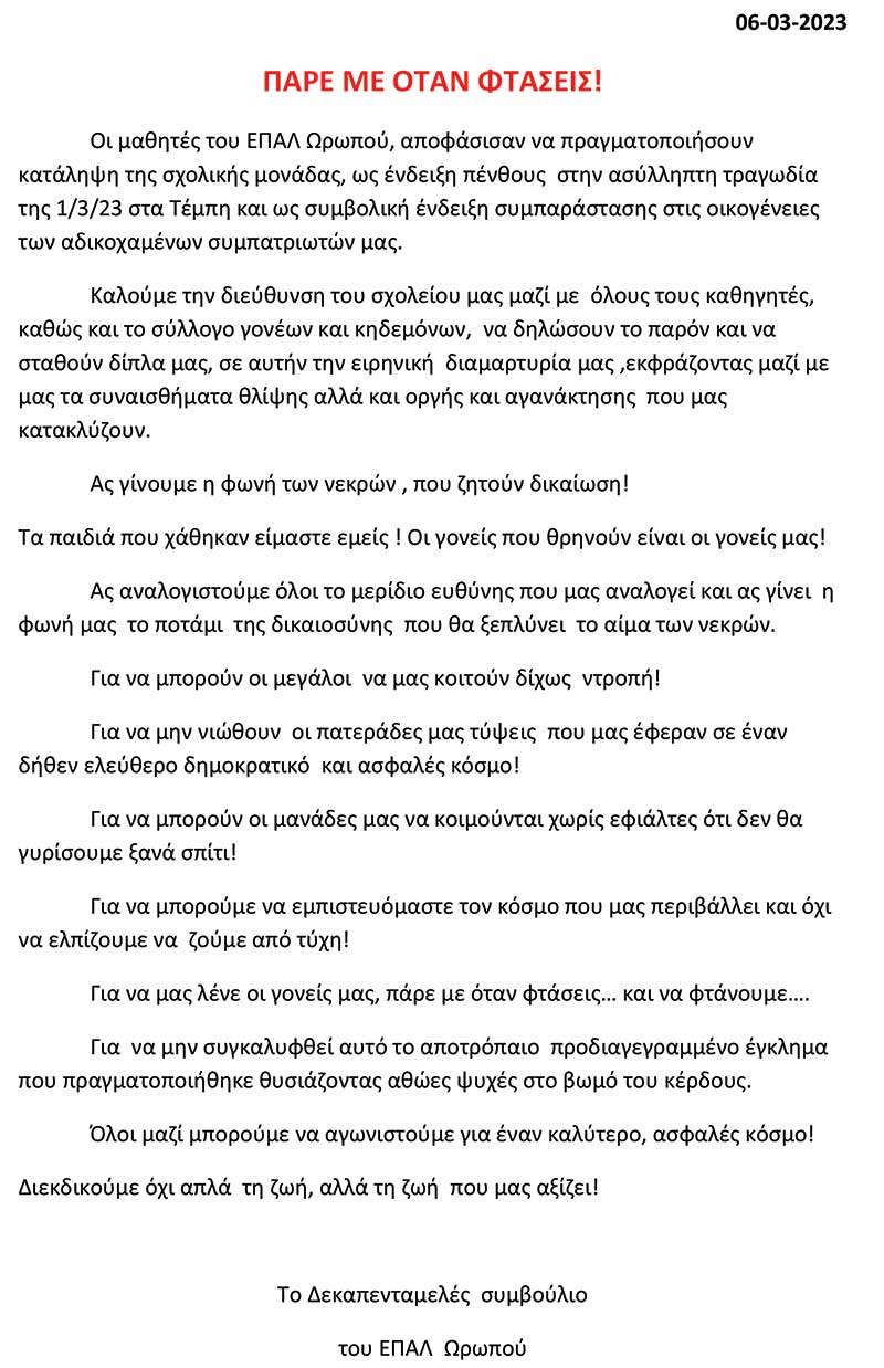 Υπό κατάληψη βρίσκεται το ΕΠΑΛ Ωρωπού από το πρωί της Δευτέρας 6 Μαρτίου, ως ένδειξη πένθους στην τραγωδία στα Τέμπη, σύμφωνα με ανακοίνωσή των μαθητών/τριων:
