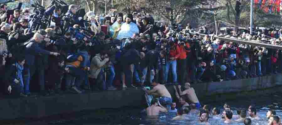 Ο σταυρός ήταν δεμένος με σχοινί λόγω της κακοκαιρίας, ενώ μια γυναίκα ήταν η τολμηρή που μπήκε στο νερό.