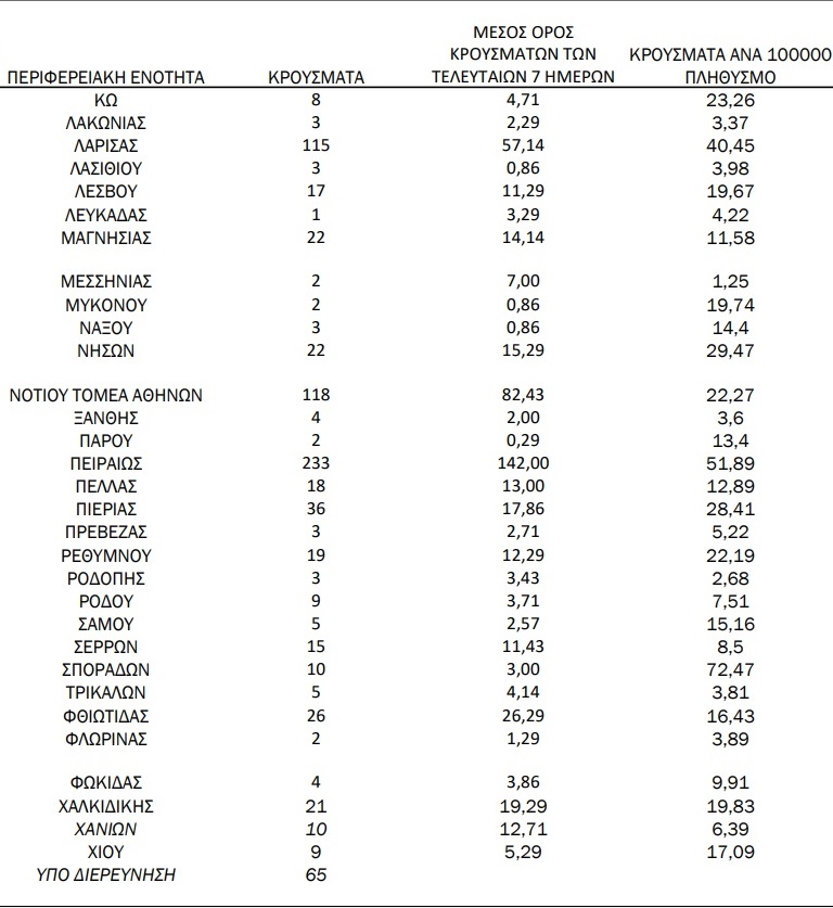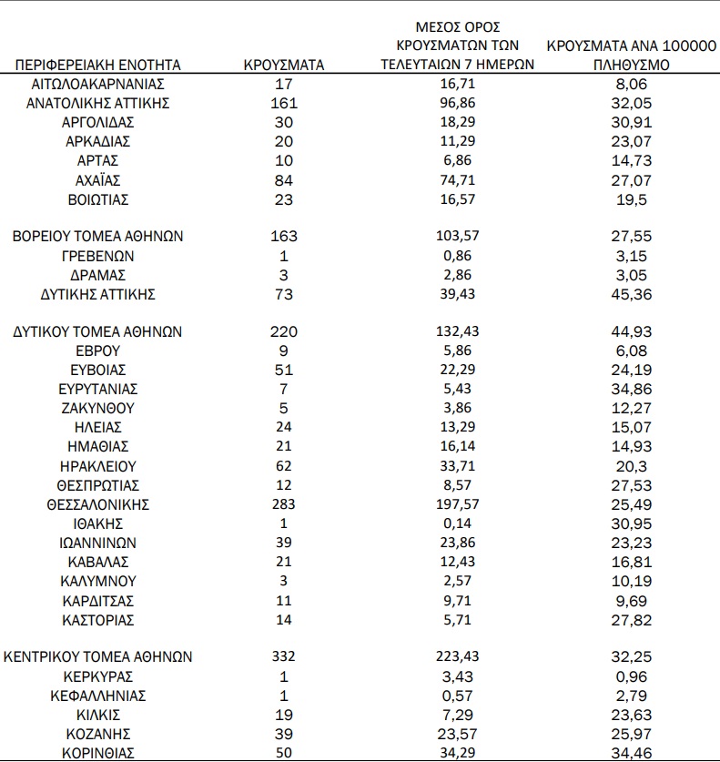 Αναλυτικά η διασπορά του κορονοϊού ανά περιφέρεια, σύμφωνα με τα στοιχεία του ΕΟΔΥ:
