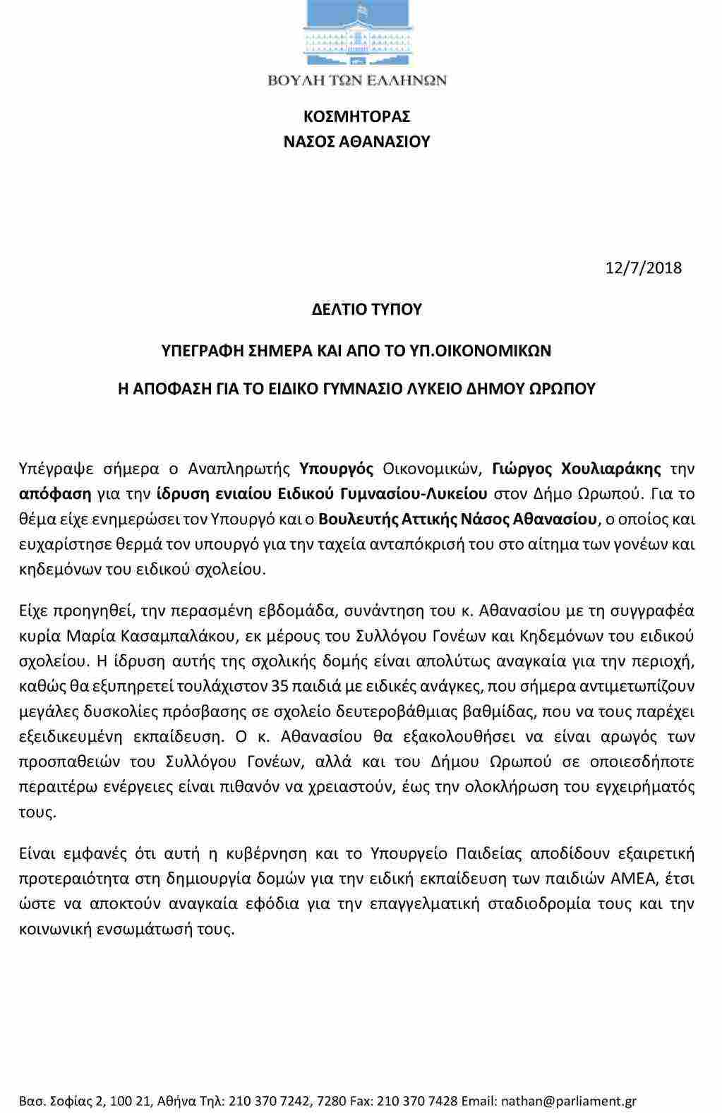 Υπέγραψε σήμερα ο Αναπληρωτής Υπουργός Οικονομικών, Γιώργος Χουλιαράκης την απόφαση για την ίδρυση ενιαίου Ειδικού Γυμνασίου-Λυκείου στον Δήμο Ωρωπού. Για το θέμα είχε ενημερώσει τον Υπουργό και ο Βουλευτής Αττικής Νάσος Αθανασίου, ο οποίος και ευχαρίστησε θερμά τον υπουργό για την ταχεία ανταπόκρισή του στο αίτημα των γονέων και κηδεμόνων του ειδικού σχολείου.
