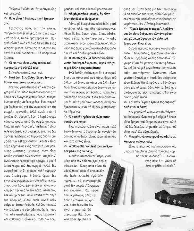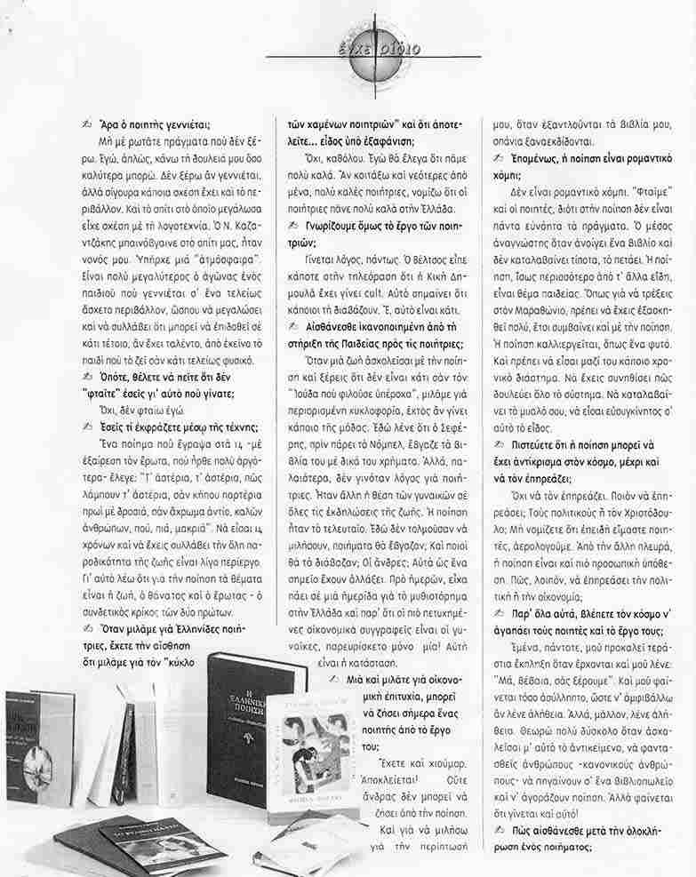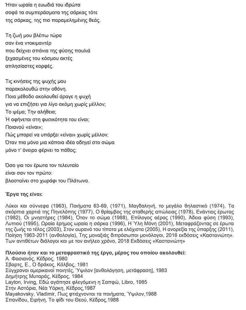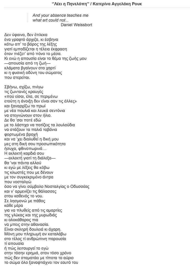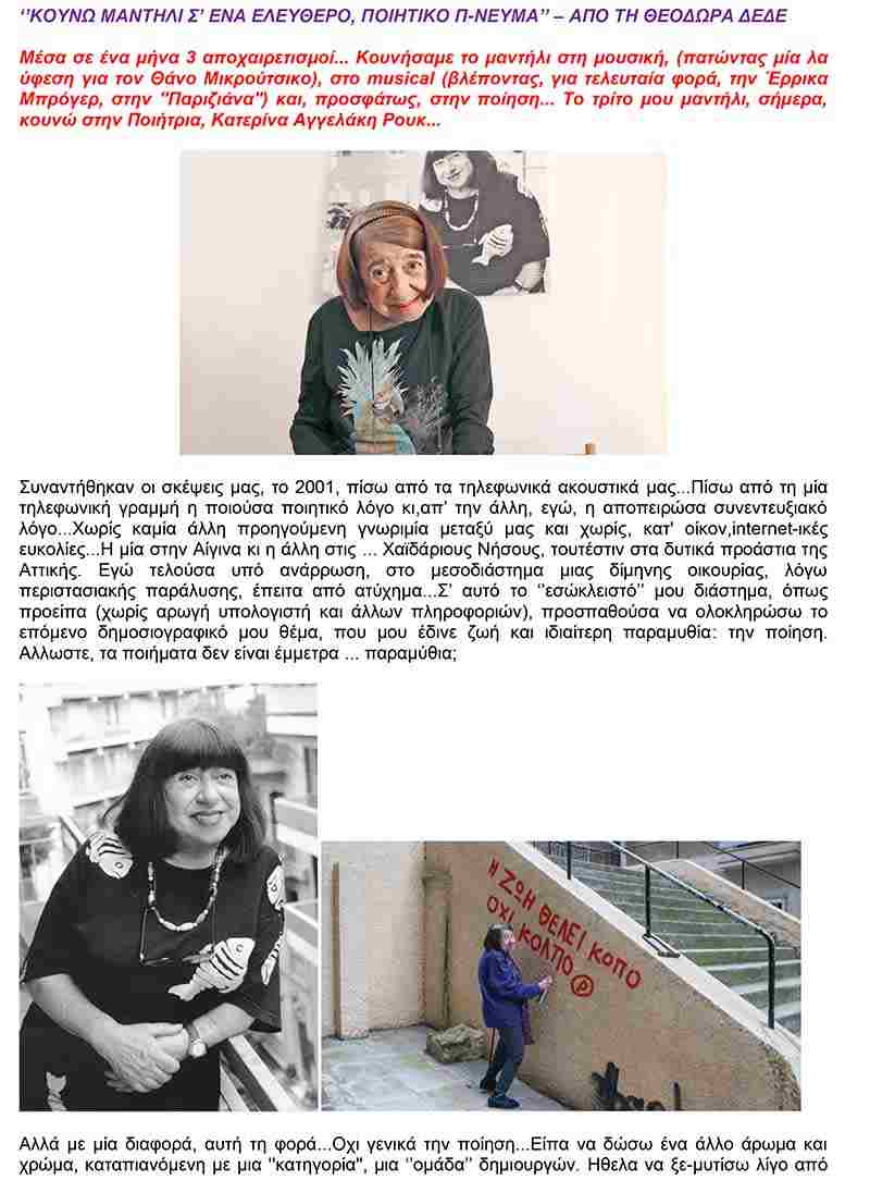Θεοδώρα ΔέδεΡοή ΝέωνΤελευταία ΝέαΤέχνες Κουνώ μαντήλι σε ένα ελεύθερο, ποιητικό π-νεύμα… Σοφία Μπασκάκη 29 Ιανουαρίου, 2020 Ακολουθεί όλο το αφιέρωμα με τίτλο “Ποίηση με Άρωμα γυναίκας” που δημοσιεύτηκε στο περιοδικό NEMECIS ΠΟΙΗΣΗ ΜΕ ΑΡΩΜΑ ΓΥΝΑΙΚΑΣ (”NEMECIS”)