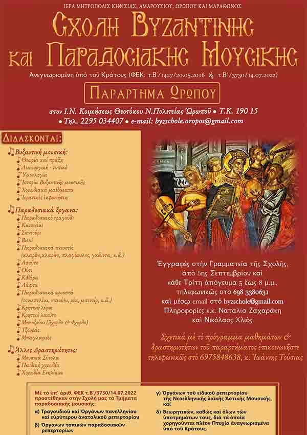 Με την ευλογία και την προτροπή του Σεβασμιότατου Μητροπολίτη Κηφισίας, Αμαρουσίου, Ωρωπού & Μαραθώνα κ. Κυρίλλου, από φέτος, λειτουργεί παράρτημα της Βυζαντινής και Παραδοσιακής Μουσικής Σχολής, της Ιεράς Μητροπόλεως μας, στην Αρχιερατική Περιφέρεια Ωρωπού και Καπανδριτίου.