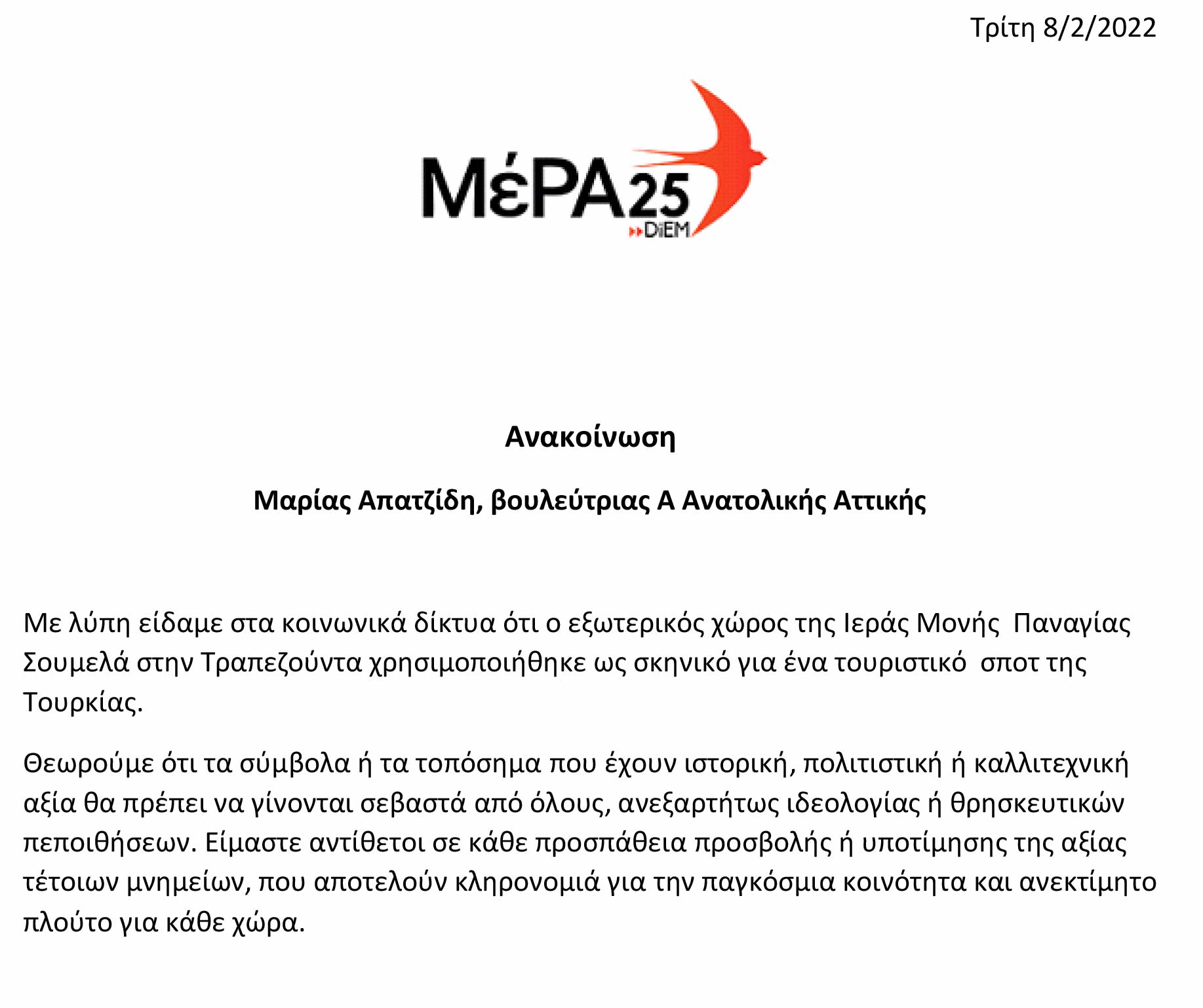 Μαρία Απατζίδη: Ανακοίνωση για την Παναγία Σουμελά