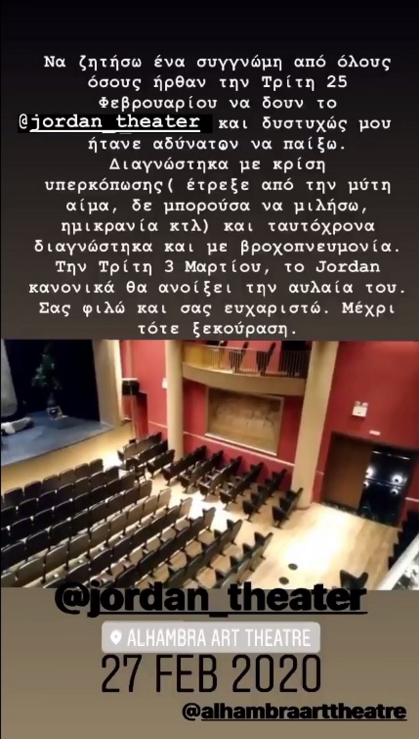 Την περασμένη Τρίτη, η θεατρική παράσταση «Τζόρνταν» ακυρώθηκε, ύστερα από σοβαρό πρόβλημα υγείας που αντιμετώπισε η Μαρία Κορινθίου. Η αγαπημένη ηθοποιός, με ανάρτησή της στα social media, ανακοίνωσε στο κοινό που είχε κλείσει εισιτήρια, πως για λόγους υγείας δεν θα μπορέσει να αντεπεξέλθει στις επαγγελματικές της υποχρεώσεις.
