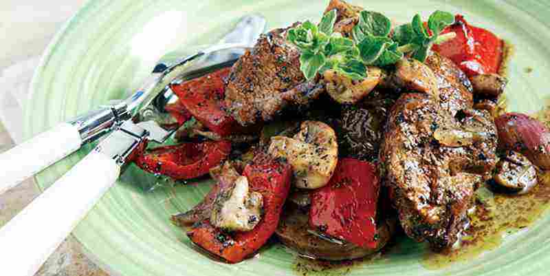 Κόβουμε τις μελιτζάνες σε φέτες, τα κρεμμύδια σε τέταρτα, τις πιπεριές σε τέταρτα και τα μανιτάρια στη μέση κι όλα μαζί τα βάζουμε σε ταψί. Περιχύνουμε με το ελαιόλαδο, το μπαλσάμικο, πασπαλίζουμε με τα μυρωδικά και αλατοπιπερώνουμε.